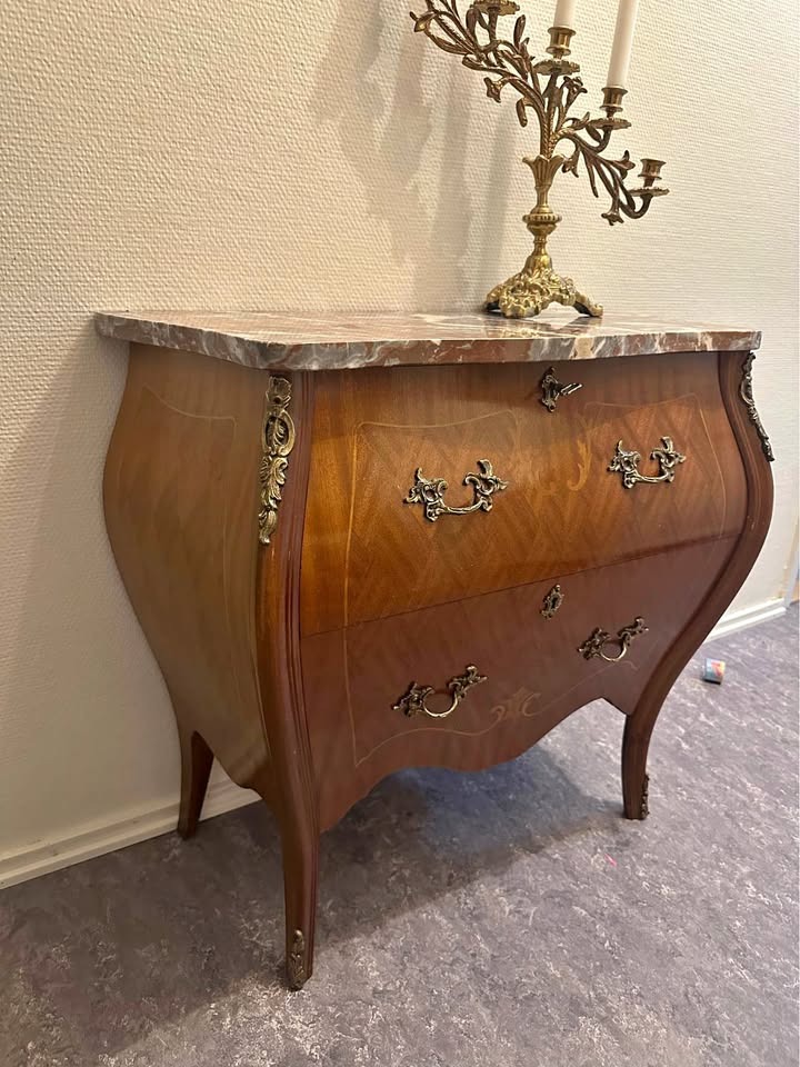 Marmorskivan är i fint skick med naturliga variationer i stenen, vilket är typiskt för äkta marmor. Inga sprickor eller allvarliga skador förekommer, och byrån står stadigt på sina eleganta svängda ben.