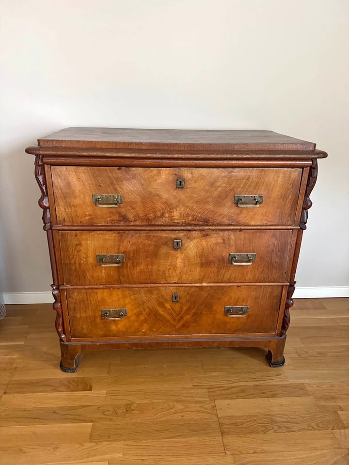 Här erbjuds en vacker antik byrå i massiv mahogny som bär med sig både historia och tidlös elegans. Möbeln har tre rymliga lådor med original mässingsbeslag och nyckelskylt, samt karakteristiska svärvda sidor och profilerad överkant som vittnar om hantverksskicklighet från en svunnen tid. De svängda fötterna ger byrån en stabil grund och bidrar till den klassiska siluetten.