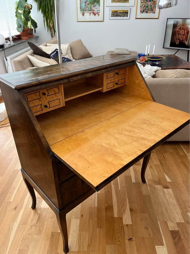 Bakom klaffen finns små fack och lådor för att organisera papper, pennor och andra föremål – en genial planlösning som var typisk för gamla sekreterärsmöbler.