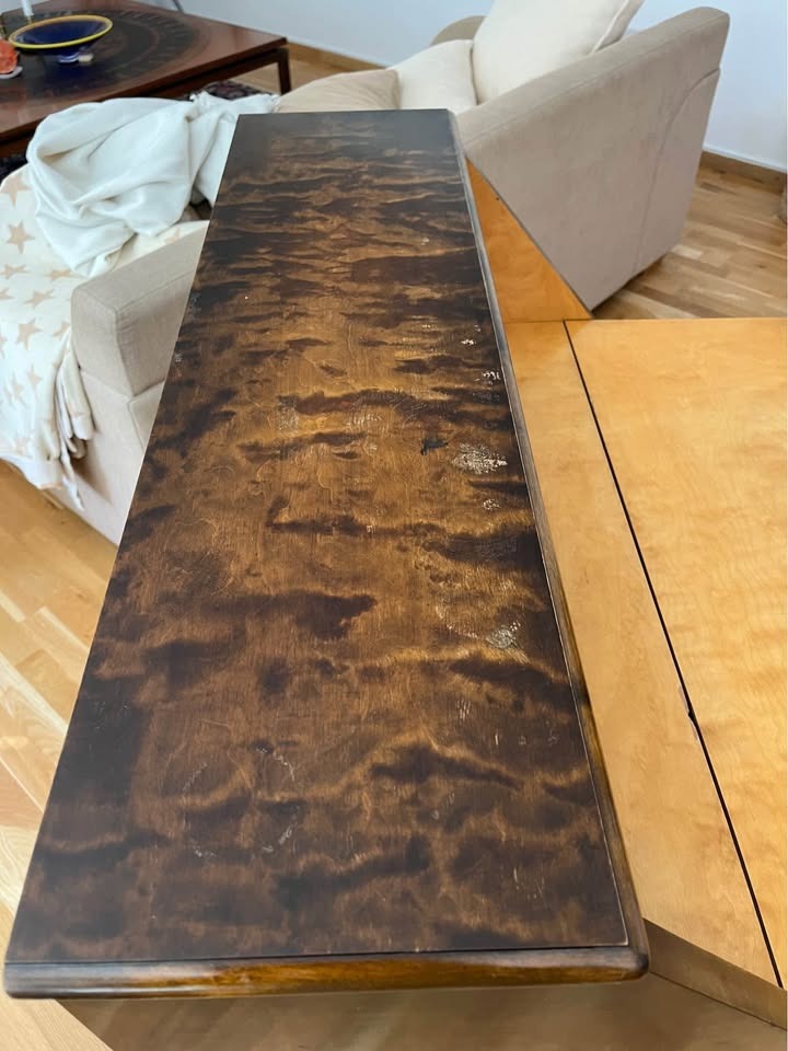 Dessa fläckar är ytliga och kan troligen mildras med rätt behandling om man önskar, men de tillför också autenticitet. Beslag och gångjärn är i fungerande skick och lådorna glider ut smidigt. Träet är stabilt utan sprickor eller lösa delar, vilket talar för att möbeln har vårdats väl genom åren.