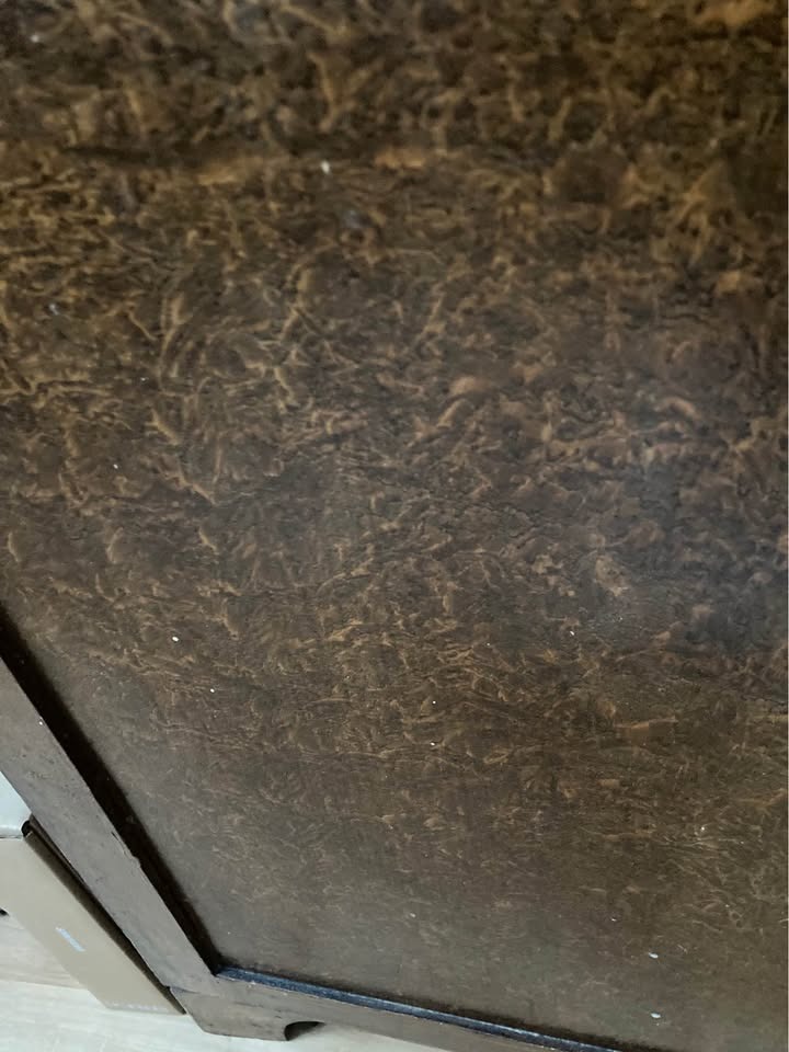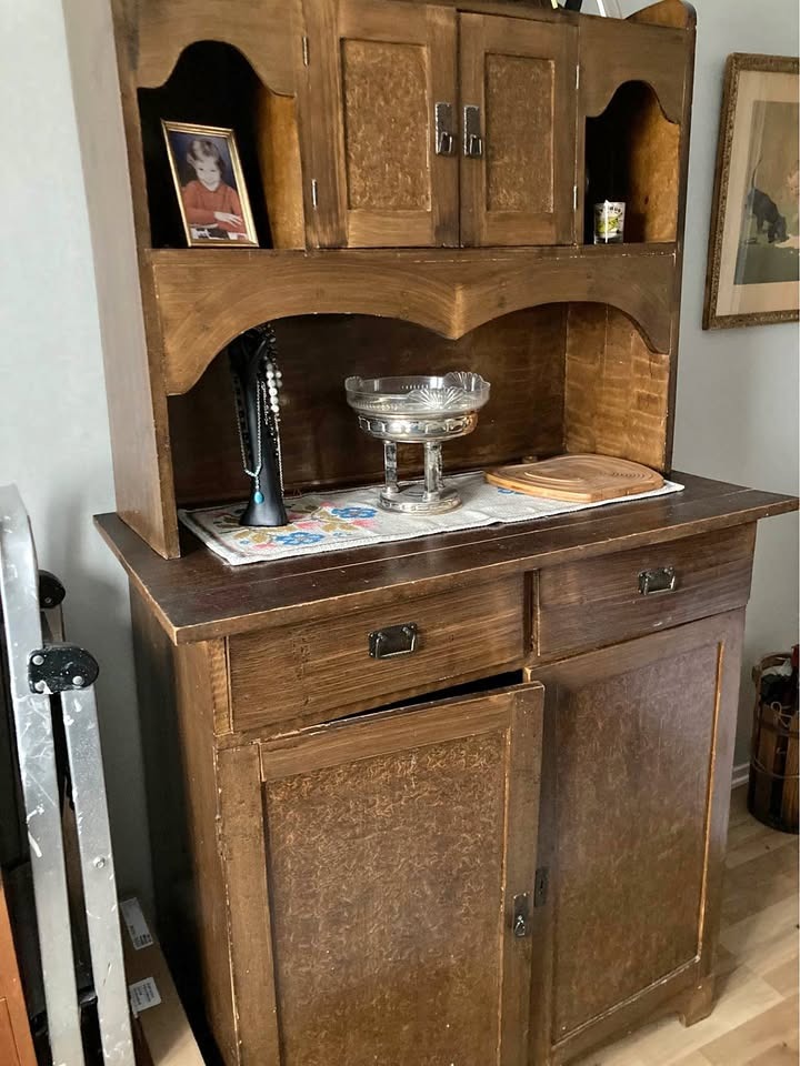 Skicket är helt i linje med möbelns ålder och historia. Ytan bär spår av decennier av användning med lätta repor, ojämnheter i lacken och mindre stötmärken som framför allt syns längs kanterna och dörrarna. Träet har en varm honungsbrun ton med inslag av mörkt karamellgult där årsringarna tydligt framträder.