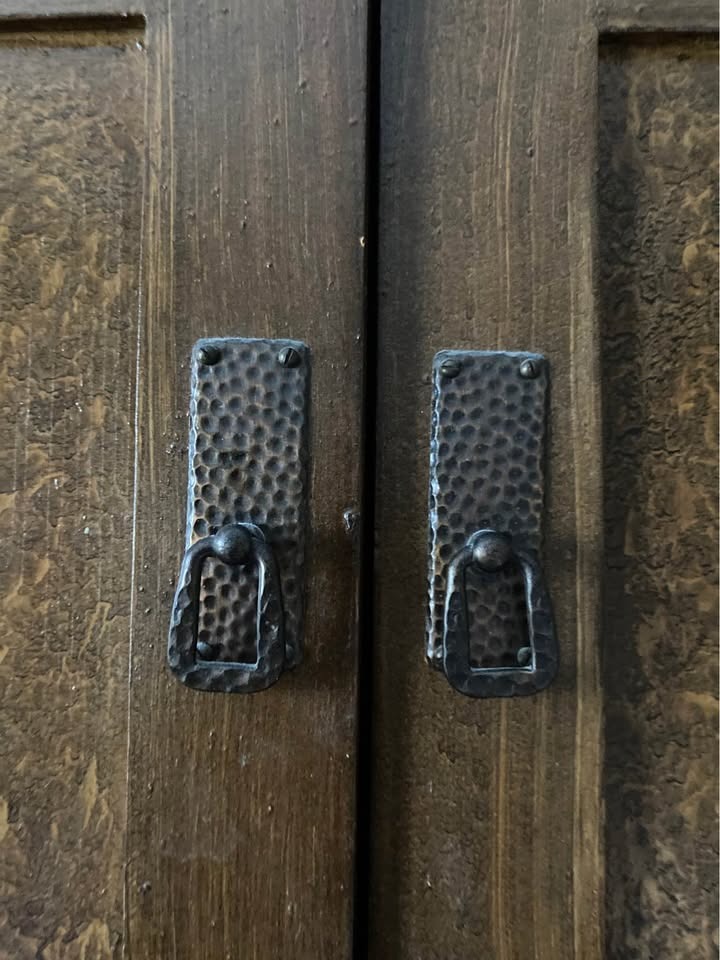 På vissa ställen är ytan något mattare än på andra, vilket är naturligt för ett skåp som passerat genom flera generationer. De smidda handtagen har utvecklat en vacker grönaktig patina som är typisk för äldre järnarbeten.