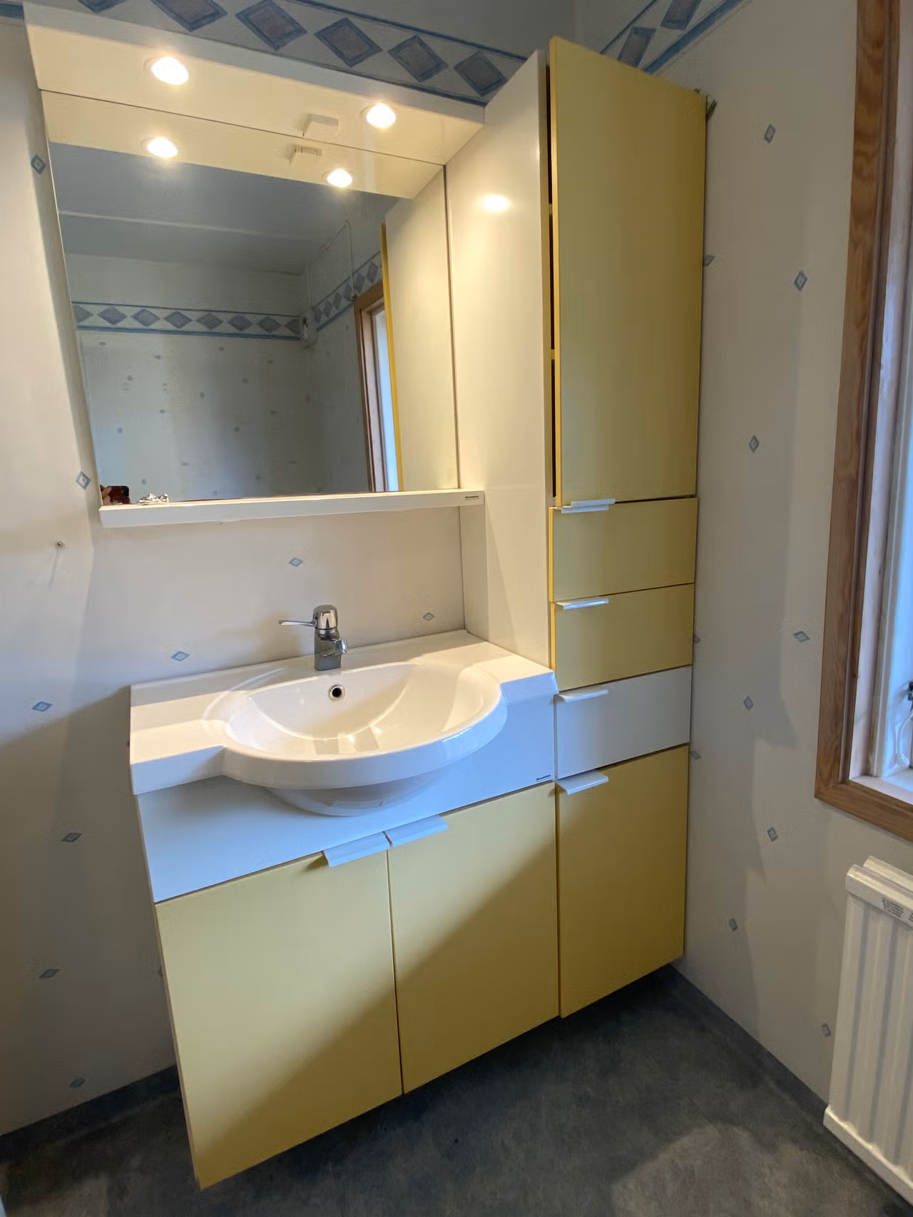 Inredningen består av ett väl utformat handfat, en spegel med inbyggd belysning, skåpenheter med gångjärn samt monteringsutrustning. Spegeln förses med ny ljuskälla som har monterats, och denna sticker något upp – en mindre justering som lätt kan göras vid installation. Gångjärnen på skåpen kan behöva en liten justering för optimal stängning. Utöver huvudinredningen ingår även en betydligt nyare toalettstol samt en gammal duschkabin som är nedmonterad och klar för avhämtning.