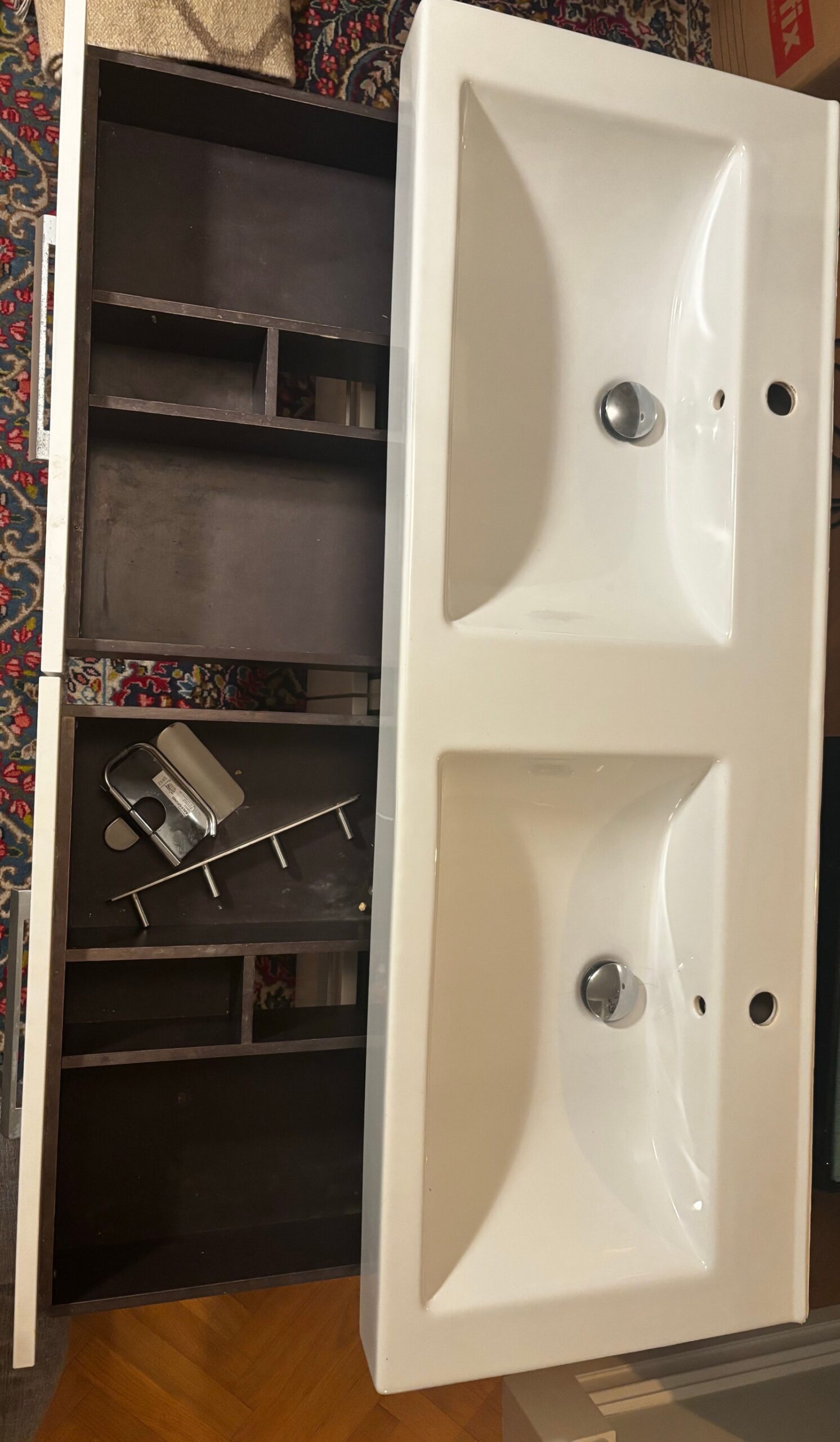 Med dubbla handfat är denna kommod idealisk för badrum där två eller flera personer behöver använda tvättställena samtidigt. Det sparar tid på morgonen och eliminerar många av de klassiska konflikterna i familjehem. De flera lådfacken med metallhandtag erbjuder flexibel förvaring för allt från handdukar och tvättartiklar till kosmetika och mediciner. Du kan organisera innehållet exakt efter dina behov – några lådor för handukar, några för personlig hygien, och några för andra badrumsartiklar. Denna flexibilitet gör kommoden lämplig för många olika användningsfall, från familjehem till mindre hotellrum eller wellness-inrättningar.