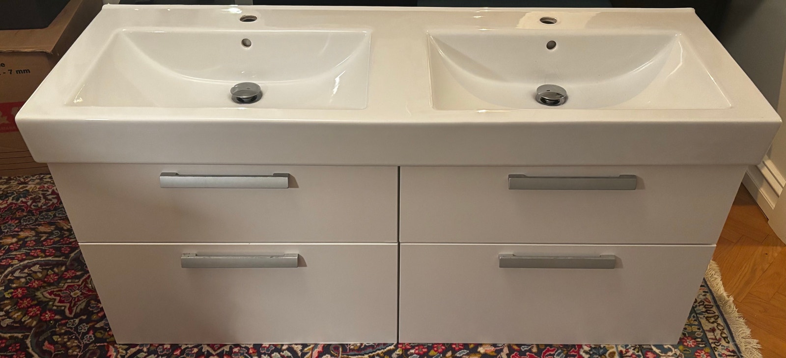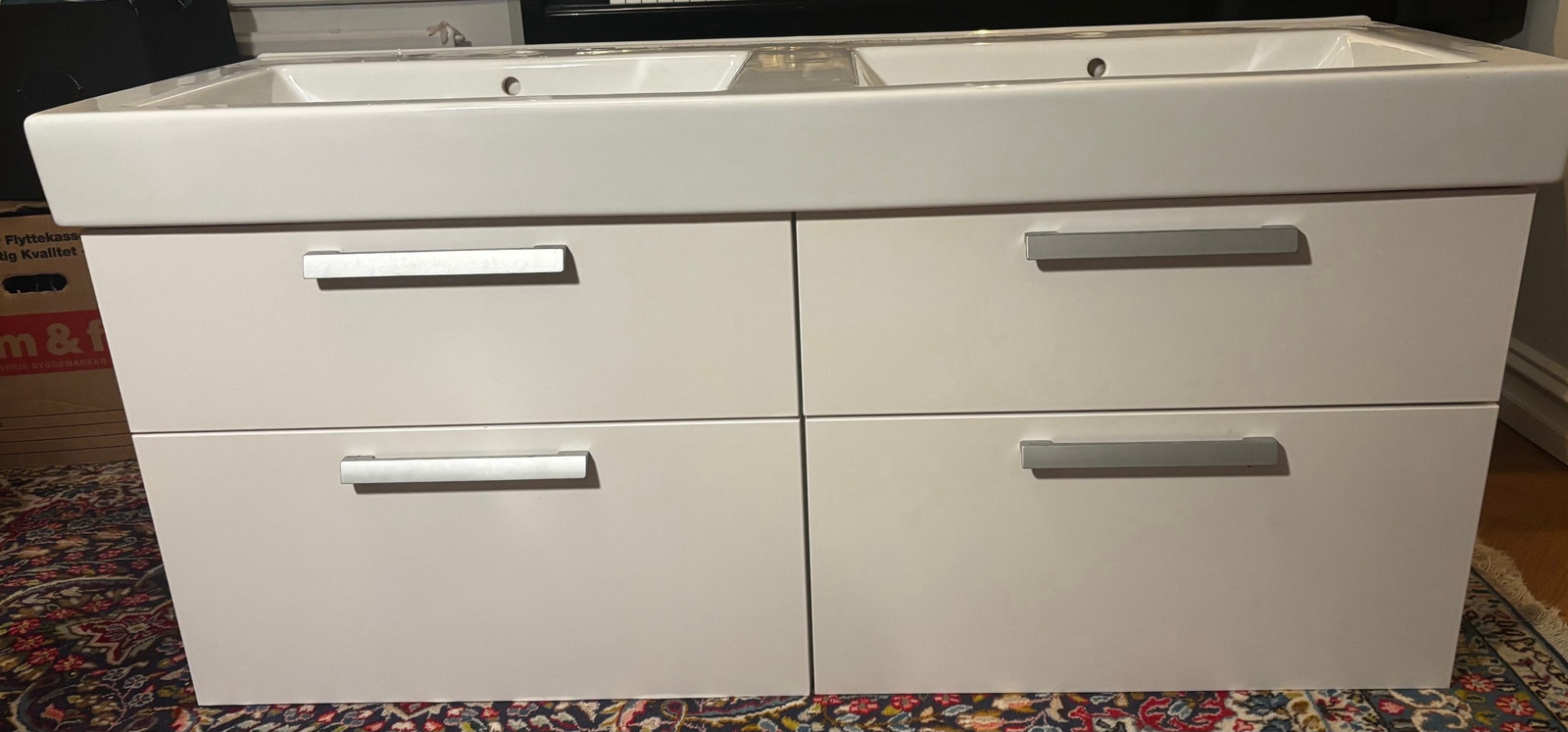 Väldesignad badrumskommod från Aspen i vitt med dubbla handfat och rymligt förvaringsutrymme. Denna begagnade badrumskommod mäter 134 × 48 × 62 cm och är perfekt för större badrum, gäststugor eller tvättstugor där du behöver både funktionalitet och extra lagringsutrymme. Kommoden är väl använd men helt och klockren – helt enkelt en smart investering för den som söker begagnad badrumskommod i Göteborg till en överkomlig pris. Med två praktiska handfat och flera lådfack med metallhandtag erbjuder denna möbel en utmärkt balans mellan estetik och praktisk användning. Hemleverans inom 24 timmar är möjlig i Göteborg. Säker betalning via Swish eller kontant vid leverans.