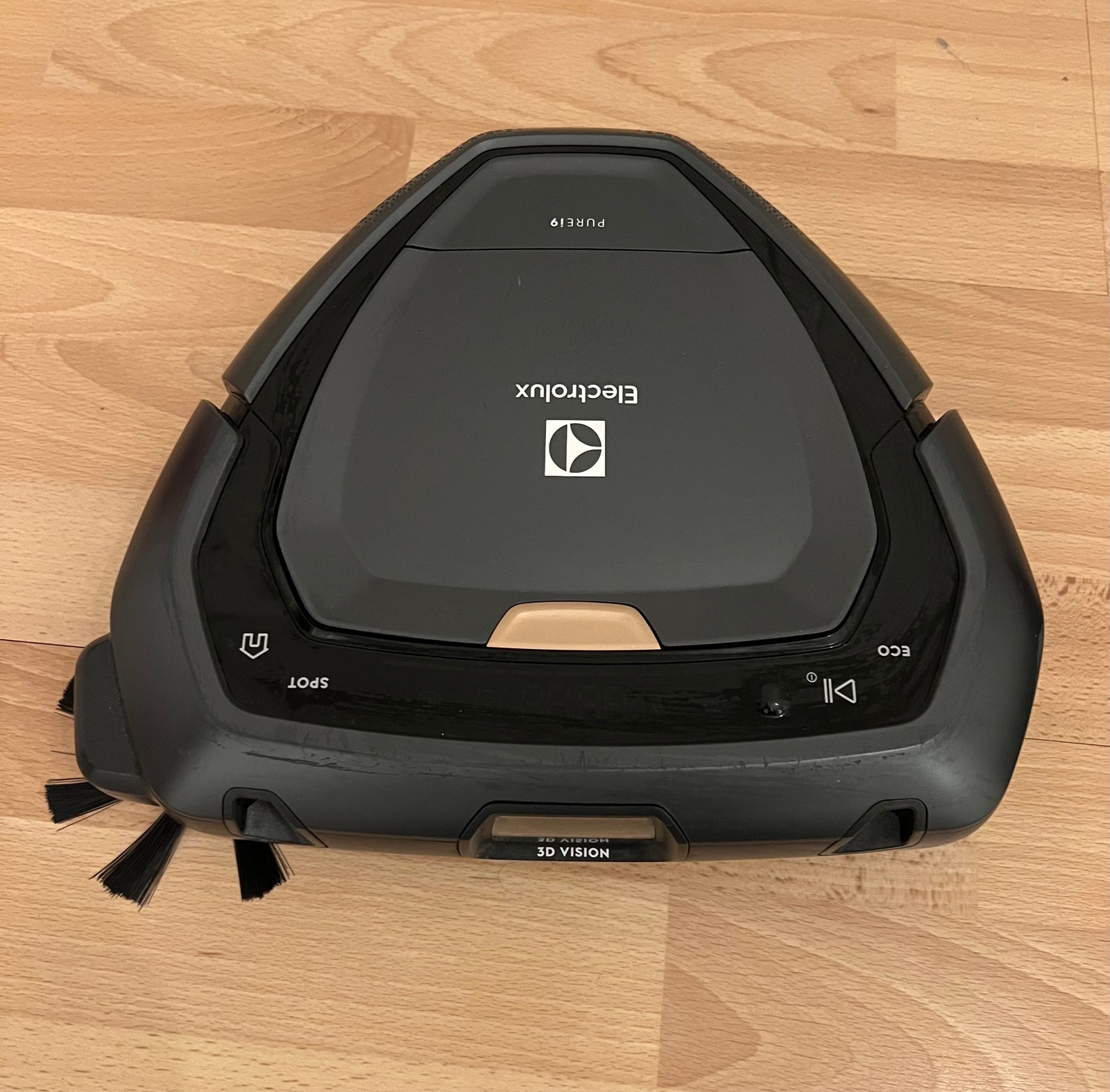 Begagnad Electrolux Pure i9 robotdammsugare i elegant svart färg, designad för effektiv och automatiserad golfrengöring. Denna smarta rengöringsenhet har triangulär form som möjliggör att nå in i hörn och svåråtkomliga områden där vanliga dammsugare ofta missar damm och smuts.