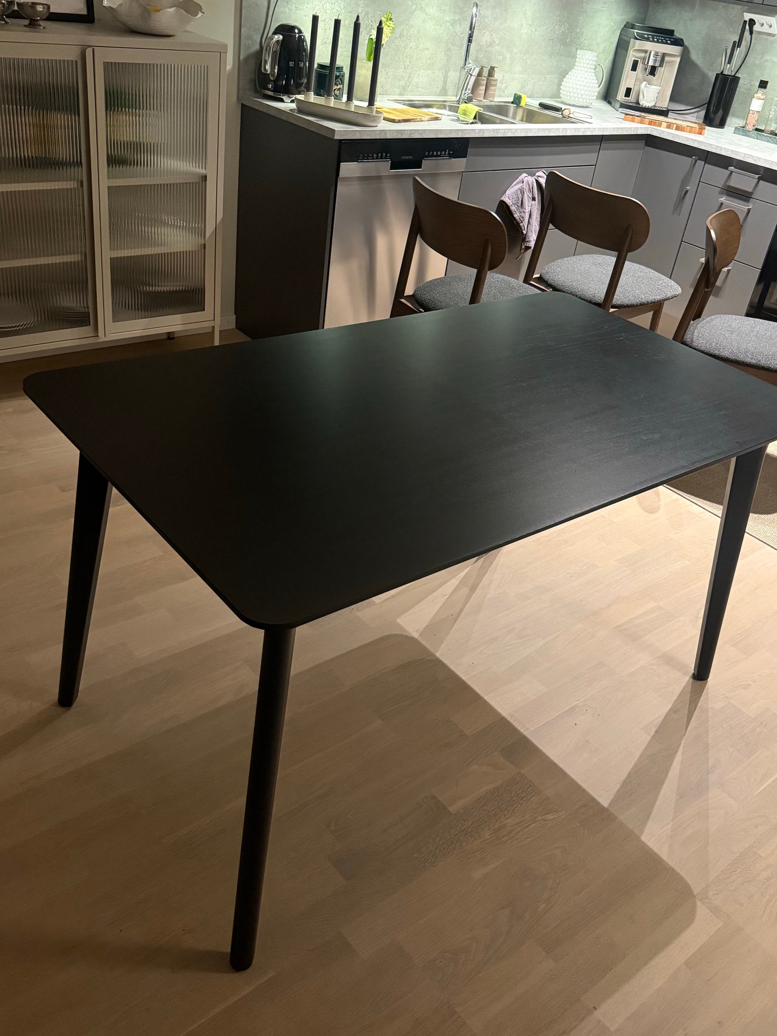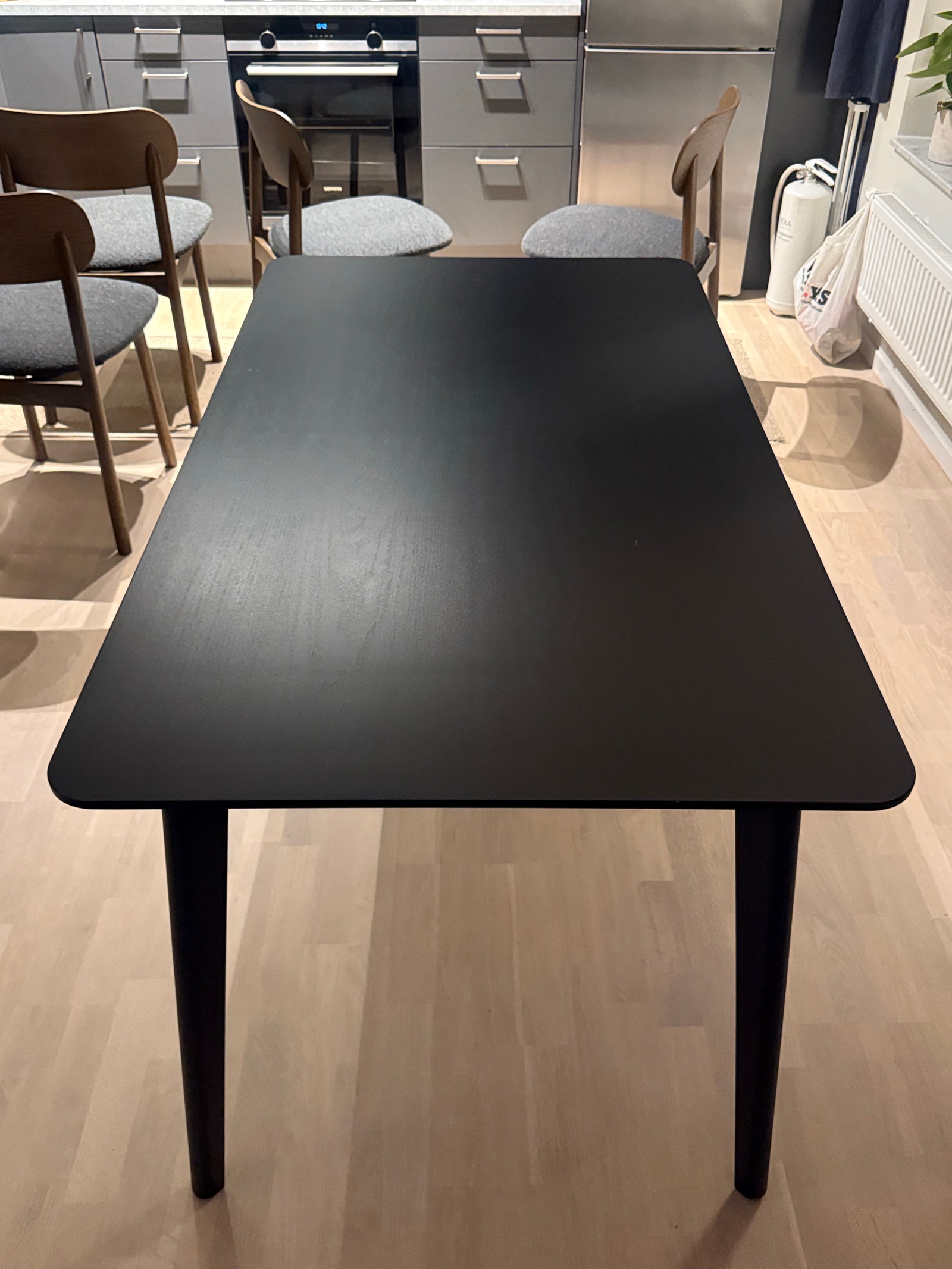 Enligt säljaren är detta matbord i jättefint skick, vilket betyder att det har använts varsamt och underhållits väl under sin tidigare tid. Det finns inga större färgskäpp på bordsytan, vilket tyder på att bordet inte har utsatts för hårt slitage eller felaktig hantering. Du kan se från bilderna att den svarta färgen är välbevarad och har sitt ursprungliga utseende behållet, vilket är imponerande för en begagnad möbel. ✨