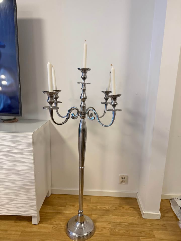 En vacker silverkandelaber som är perfekt för den som söker ett klassiskt inslag av elegans till hemmet. Denna kandelaber är en tidlös möbel som passar lika väl i vardagsrummet som vid dukat bord eller på en konsol i hallen. Med sin höga siluett på cirka 118 centimeter skapar den en dramatisk vertikal accent i rummet och blir omedelbar en blickfångare wherever den placeras.