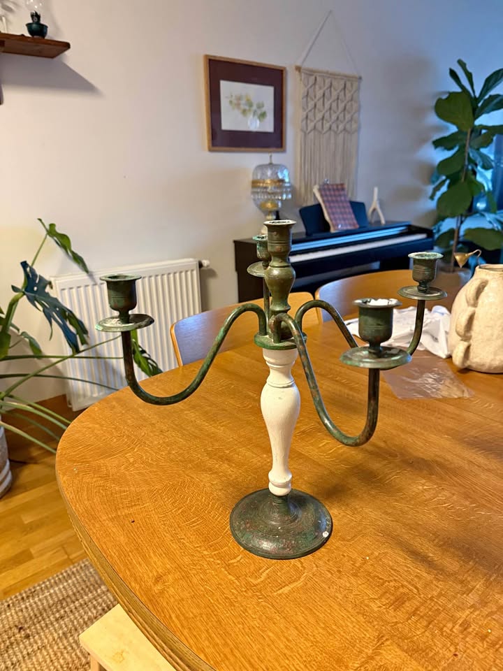 De två böjda armarna i mässing är förhållandevis tjocka och väl utförda, designade för att hålla stearinljus på klassiskt vis.