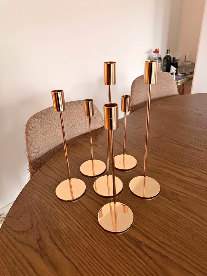 Här är en elegant uppsättning med sex moderna ljusstakar i kopparfärgad metall som skapar en stilfull atmosfär i hemmet. Ljusstakarna är utformade med en minimalistisk design som passar perfekt i samtida inredning, och den varma koppartonens glans fångar ljuset på ett vackert sätt.