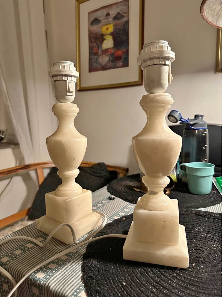 Angående skicket är dessa ljusstakar i väldigt fint begagnat skick. De är inte nya, men de visar minimal slitage och är väl omhändertagna under sin tid. Alabastern är helt intakt utan sprickor eller större märken, och metallskärmarna sitter säkert på plats utan att skaka eller sitta löst.